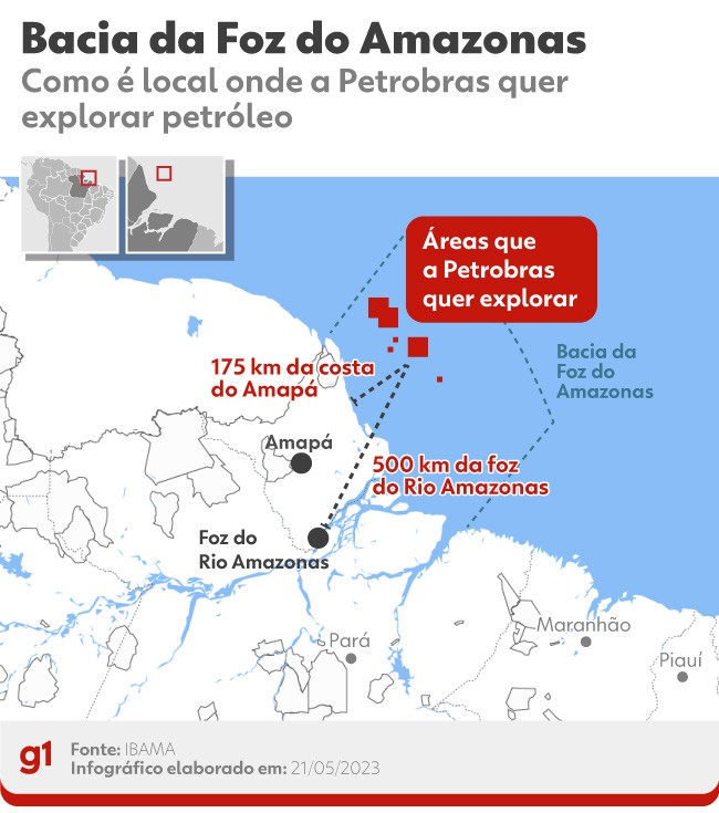 Infográfico mostra o local em que a Petrobras quer explorar petróleo na bacia da Foz do Amazonas