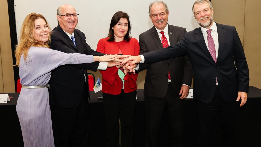 Financiamento incentivará adoção de práticas sustentáveis, com foco na Conferência Anual do Clima da ONU de 2025, em Belém. Bancos públicos de desenvolvimento também anunciaram aliança para promover ações sustentáveis. O presidente do BID, Ilan Goldfajn, a ministra Simone Tebet (Planejamento) e o presidente do BNDES, Aloizio Mercadante, na assinatura da carta de intenções para uma linha de crédito amazônica.