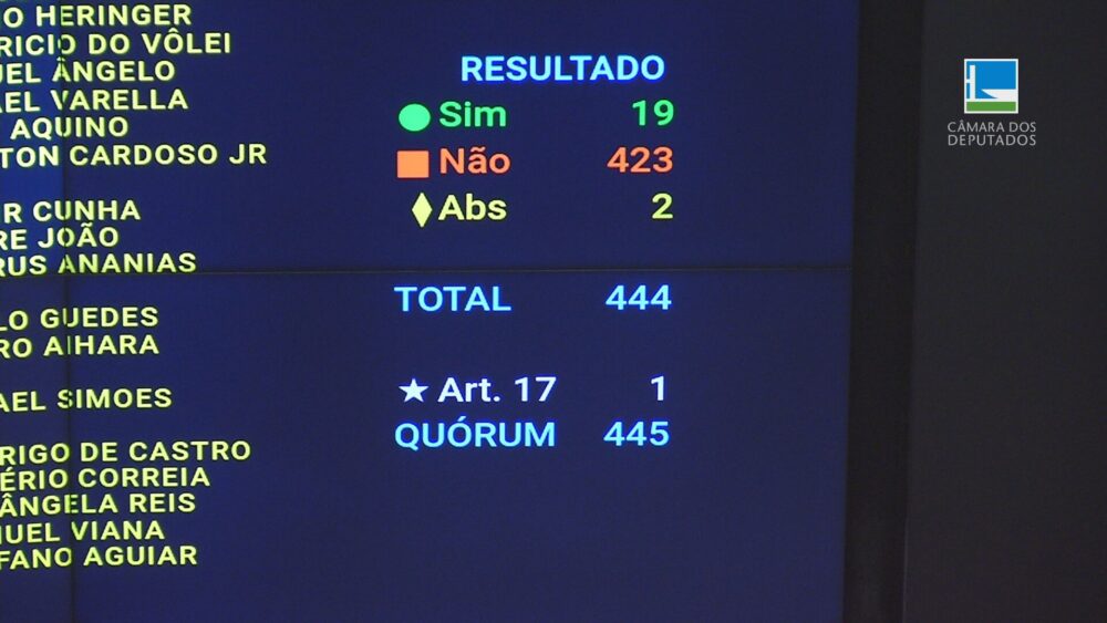 Depois, a Câmara derrubou um item incluído durante a tramitação no Senado e defendido pelo governo. Dessa vez o placar foi 423 a 19 pela rejeição.