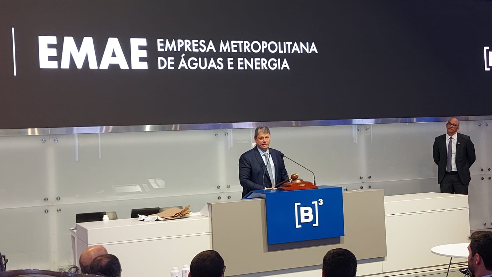 Três consórcios participaram da disputa por 4,7 milhões de ações na sede da Bolsa de Valores nesta sexta-feira (19). A oferta vencedora foi da Phoenix Fundo de Investimentos em Participações Multiestratégia com a oferta de R$ 70,65 por ação. Tarcísio de Freitas participa do leilão na Emae na sede da Bolsa Valores