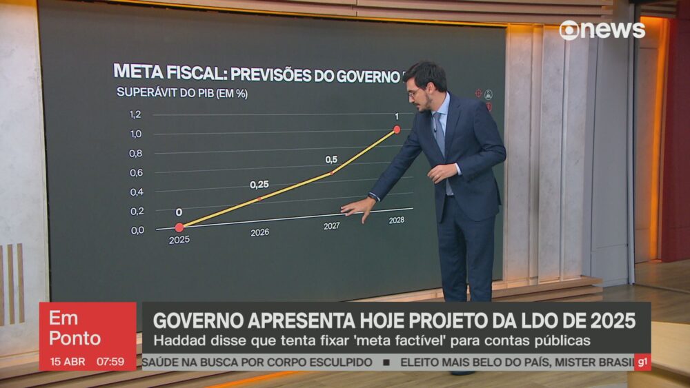 Uma fonte do Ministério da Fazenda disse ao g1 que o governo federal vai propor déficit zero para as contas em 2025 no projeto da Lei de Diretrizes Orçamentárias (LDO) para o próximo ano, que será entregue nesta segunda-feira (15). Na LDO anterior, o projetado era de superávit de 0,5% do Produto Interno Bruto (PIB).