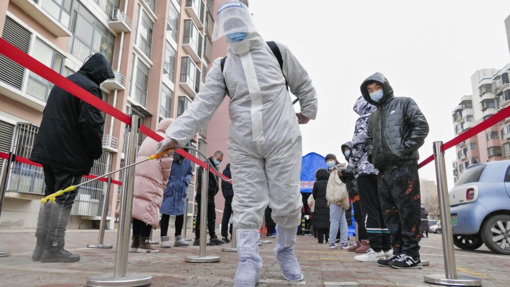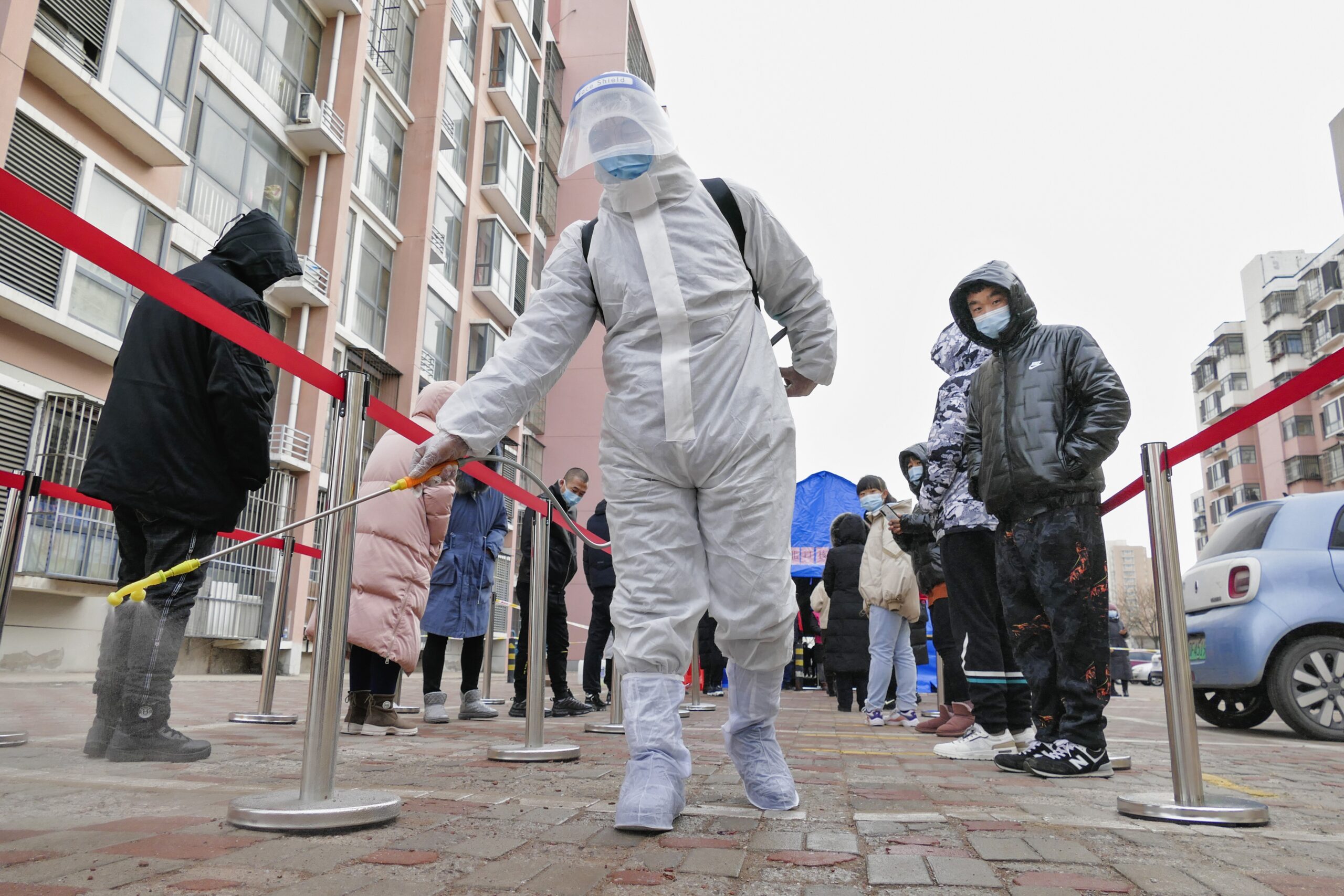 Nos 3 últimos meses do ano passado, expansão foi de 4% frente aos 3 meses anteriores, após uma alta de 4,9% no 3º trimestre, em meio a sinais de enfraquecimento do consumo e de desaceleração do setor imobiliário. Profissional com roupa de proteção pulveriza desinfetante em uma fila para testes de Covid-19 em massa na cidade de Tianjin, no norte da China, em 9 de janeiro de 2022