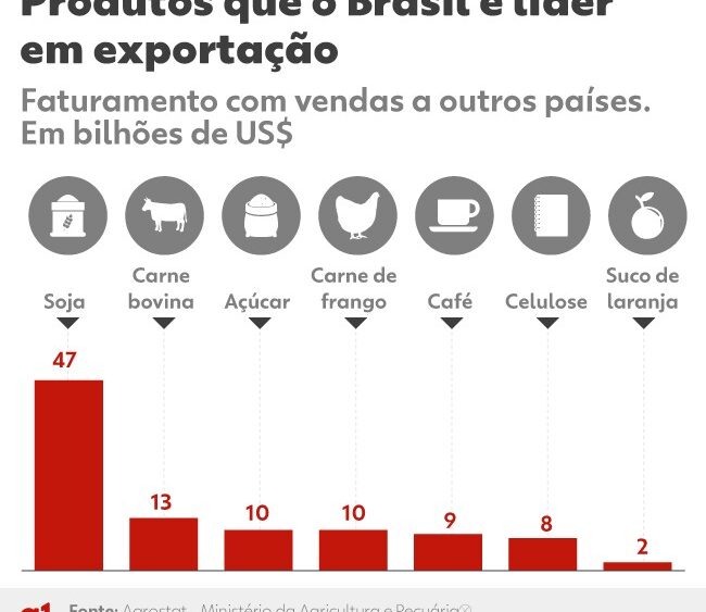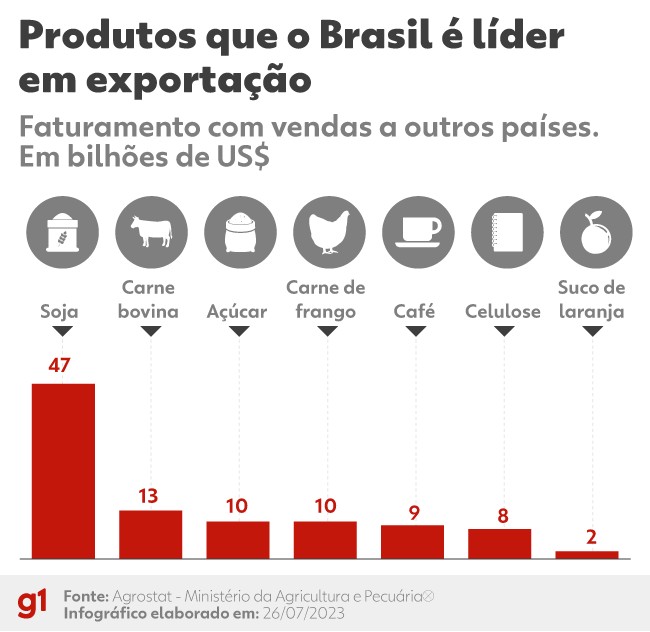 País deve se tornar o principal fornecedor de milho em 2023, ultrapassando os EUA, e o maior vendedor de farelo de soja, superando a Argentina. Faturamento da soja, carne bovina, açúcar, carne de frango, café, celulose e suco de laranja.